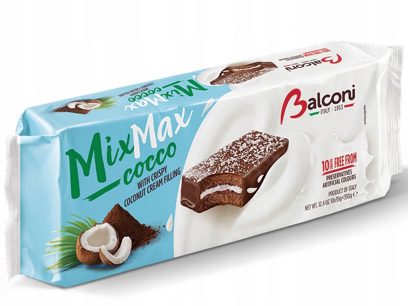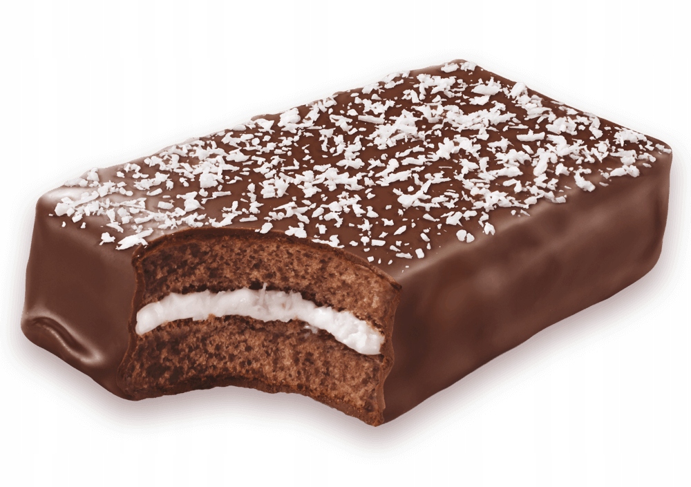 - Smak: Delikatny biszkopt z kremowym nadzieniem kokosowym i polewą czekoladową